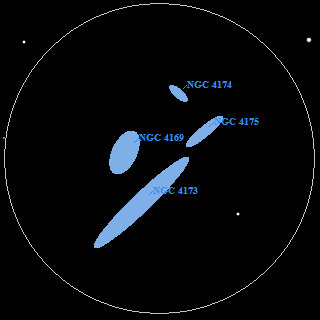 ![]() The brightest member, the 13.3-magnitude Lenticular galaxy NGC 4169, can probably be glimpsed in an 8-inch. In my 18-inch at 260x it appeared features and round. The next easiest to detect is the tiny NGC 4174, a nearly edge-on 14.5 magnitude spiral. At 94x it appeared nearly stellar and could be easily mistaken for a star. At 260x the bright central core appeared nearly stellar, but a slight, elongated haze could also be detected. NGC 4175 is 14.3-magnitude edge-on spiral that shows evidence of interaction with a neighbor. At 260x this galaxy appeared as an elongated haze. Finally, NGC 4173 is the largest of the four, but the most difficult. Another interacting spiral galaxy, this 13.8 magnitude galaxy has a very low mean surface brightness of 23.7 mag/arc-sec2. This one can be difficult and was not at all obvious at 94x. It was more easily seen ay 260x, where it appeared long, thin, and quite diffuse. It is this galaxy and the nearby NGC 4175 that together form a nearly perfect line. Interestingly, the three other galaxies all have recession velocities of around 2900 km/sec, but at 1100 km/sec NGC 4173 is receding much more slowly. C. Mendes de Oliveira applied the Tully-Fisher relation to these galaxies as an independent method of determining their distances. The Tully-Fisher relation applies the empircal relationship between the Luminosity of a spiral galaxy and its rotational velocity. Once the rotational velocity is measured, the Luminosity can be inferred and this together with the apparent brightness of the galaxy gives us an estimate of its distance. It truns out that, as the recessional velocities indicate, NGC 4173 is a foreground object not physically associated despite the coincidental evidence of interaction. ![]() The field in an 12-inch at 300x. North is down and east is to the right. |