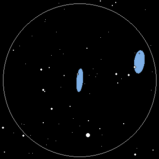 Three bright galaxies in Leo form a famous trio. The two brightest are M65 and M66. They are visible in even the smallest amateur instruments from a suitably dark site. The third is NGC 3628. Although it wasn't observed by Messier, it is still an excellent target for telescopes large and small. Burnham's noted that they "form a noble group for the small telescope." The M65, M66 and NGC 3628 trio. M65 is upper left. M66 upper right. The field is 1o x 1o. North is down and east is to the right. ![]() William Herschel described M65 as "a very brilliant nebula, extended in the meridian, about 12' long. It has a bright nucleus, the light of which suddenly diminishes on its border, and two opposite faint branches." Walter Scott Houston noted that although he was aware of the dark lane it "was only suspected, and probably not seen at all" in his 10-inch under dark skies. ![]() The field in a six-inch at 50x. North is down and east is to the right. |