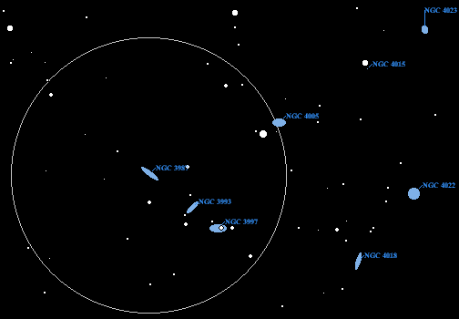 Sometimes it takes serendipity to discover an interesting object or field that lies off the beaten path. In this case it took a supernova for me to be led to this fine galaxy and surrounding field. In March of 2001 a relatively bright (14th mag) supernova was found in this galaxy and I set out to observe it. I found a small, but delightful galaxy in a field with many others. The supernova appeared as a 14th magnitude star sitting near the extreme northeastern end of the galaxy. Having seen it, I moved on to explore the surrounding field, which is quite remarkable! A chain of three additional faint galaxies lie to the northeast, nestled in among a smattering of stars. In scanning around the area I found countless other tiny galaxies. ![]()