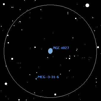 The faint companion to the south, NGC 4027A, should be visible in large instruments from a dark site. This tiny 15-th magnitude galaxy is a mere 56" x 38" across.