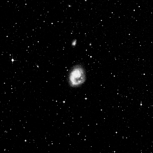 In smaller scopes look for a small, elongated smudge of light. This bright southern region should be apparent in any scope. Look for a faint halo surrounding the galaxy; the bright region will be defintely off center in the halo. There is a faint star to the northeast of the bright portion. The curving arc emanating from the bright region should be visible arcing through this star in larger instruments with good seeing.