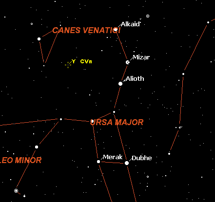 This star is of interest because of its deep red color. If you have never seen a truly red star in the telescope, this one should be a real treat. Father Secchi is said to have referred to is as "La Superba." On my 18-inch f/4.5 Y CVn appeared as a deep, fiery orange with a tinge of yellow. The orange was so deep that I was tempted to call it "dark!" Why is this star red? Stars emit radiation all across the spectrum, from the radio to gamma regions. But the amount of radiation produced peaks somewhere in the middle, usually near the optical region (the small range of wavelengths that our eyes are sensitive to). Exactly where this peak lies depends on the temperature of the surface of the star. Very hot stars peak closer to the blue and cooler stars peak closer to the red. So a very red star like Y CVn is a very cool star. Usually a star is so hot that it contains only atoms -- molecules are disassociated as soon as they form. But if a star becomes cool enough molecules will appear. In this case molecules of carbon abound in the outer atmosphere. These carbon molecules readily absorb blue and ultraviolet light, leaving the star to appear even redder. ![]() The finder chart above shows the location of Y CVn between the handle of the Big Dipper and Cor Coroli in Canes Venatici. |
