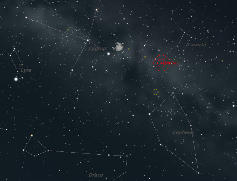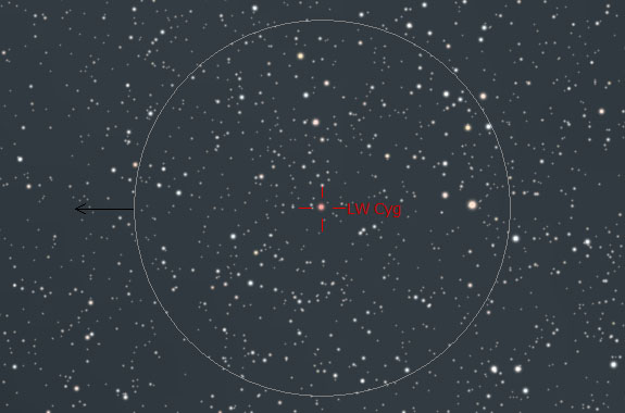 LW Cyg is a slowly varying "irregular" variable star that is known for its red hue. This carbon star varies from about 8.5 to 8.8 magnitude. Carbon stars are named for the relatively large amounts of carbon observed in their spectra. This star is very cool, which makes it appear deep red in the telescope. One look at the field and it should jump right out at you. While you are there, have a look for the 12th magnitude companion star some 84" away to the west. This pair is almost certainly not physical. ![]() LW Cygni lies close to the Cygnus/Lacerta border. North is up and east is left. ![]() The field in a 6" at 50x. North is down, east is right. |