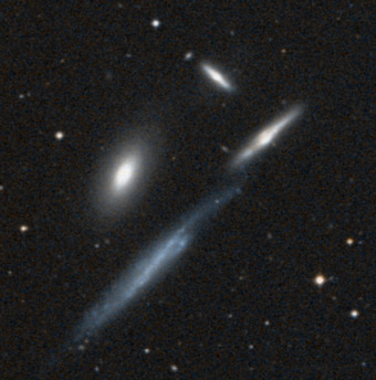 The brightest member, the 13.3-magnitude Lenticular galaxy NGC 4169, can probably be glimpsed in an 8-inch. In my 18-inch at 260x it appeared features and round. The next easiest to detect is the tiny NGC 4174, a nearly edge-on 14.5 magnitude spiral. At 94x it appeared nearly stellar and could be easily mistaken for a star. At 260x the bright central core appeared nearly stellar, but a slight, elongated haze could also be detected. NGC 4175 is 14.3-magnitude edge-on spiral that shows evidence of interaction with a neighbor. At 260x this galaxy appeared as an elongated haze. Finally, NGC 4173 is the largest of the four, but the most difficult. Another interacting spiral galaxy, this 13.8 magnitude galaxy has a very low mean surface brightness of 23.7 mag/arc-sec2. This one can be difficult and was not at all obvious at 94x. It was more easily seen ay 260x, where it appeared long, thin, and quite diffuse. It is this galaxy and the nearby NGC 4175 that together form a nearly perfect line. Interestingly, the three other galaxies all have recession velocities of around 2900 km/sec, but at 1100 km/sec NGC 4173 is receding much more slowly. C. Mendes de Oliveira applied the Tully-Fisher relation to these galaxies as an independent method of determining their distances. The Tully-Fisher relation applies the empircal relationship between the Luminosity of a spiral galaxy and its rotational velocity. Once the rotational velocity is measured, the Luminosity can be inferred and this together with the apparent brightness of the galaxy gives us an estimate of its distance. It truns out that, as the recessional velocities indicate, NGC 4173 is a foreground object not physically associated despite the coincidental evidence of interaction.