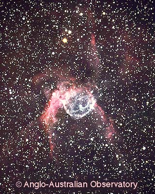 ![]() So what is this nebula? Is it a planetary? An HII region? A reflection nebula? Or perhaps something completely different? There is no simple answer. The power source for this complex nebula appears to be the Wolf Rayet star HD 56925. These stars begin life very massive, perhaps 25-40 times as massive as the sun. Such stars live their lives in the fast lane -- burning their candles at both ends, so to speak. Their lives are short but exciting. Wolf Rayet stars are typically very bright. They represent a temporary phase in the life of a massive star where it becomes very unstable, losing mass from its surface at an enormous rate. One of these stars can blow material away with velocities that approach 2000 km/sec. That's 4.5 million miles per hour! At that rate they quickly lose mass, eventually becoming a more normal, stable star. The color photograph above may be telling us a lot about what is going on here. Regions dominated by hydrogen gas, which are typical of the interstellar medium, will tend to glow red in photographs. Regions with significant amounts of other gases, particularly oxygen, often glow green or blue. That's why planetary nebulae often appear green or blue in the telescope and why an oxygen (OIII) filter works so well to show them. Based on spectra obtained with large telescopes, the "bubble" region appears to be made up of "shells" of material ejected from the star. These shells are made of nearly pure "star stuff" and glow blue in the photograph. The Wolf Rayet star also appears to be embedded in a region of hydrogen gas clouds, which are being caused to glow by this bright star. The large, bright "bar" to the southwest appears to be such a cloud--perhaps a typical HII region. Thor's Helmet -- NGC 2359