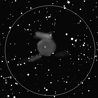 For 6-inch or larger telescopes![]() Observing Thor's Helmet In 6-inch or smaller instruments look for a rectangular-shaped hazy patch of sky. The challenge here is not only to see the nebula at all, but to perhaps see the associated "bubble" that lies at one end of the brighter rectangle. A UHC or OIII filter will help bring out the bubble. A 10-inch scope will reveal much more, even without a filter. A UHC filter will reveal some of the faint arcs that extend away from the bubble. An OIII filter may show detail in the round "bubble" portion of the nebula, including arcs near the edges. I observed Thor's Helmet in January 2000 with my 18-inch, without knowing anything about it. It made for a very pleasing find. The bright bar which runs east/west was immediately obvious. Soon I could make out the "bubble" that lies off the northeast corner of the bar. The bubble was fascinating! The edges appeared brighter than the inside and they were quite sharp. The inside of the bubble seemed at once smooth and mottled. The most intriguing thing was that the character of the light from the bubble was distinctly different from that of the bar. In time I thought I could see a faint arc running out to the northwest from the north end of the bubble, but I couldn't convince myself that this wasn't the effect from a chain of stars. The photographs plainly show that this is real, and now I wonder if I might have been able to make out the similar bar to the southeast if I had looked for it. This observation was made without a filter under average skies. I'm certain that filters and/or an excellent night would bring out much more detail. ![]()