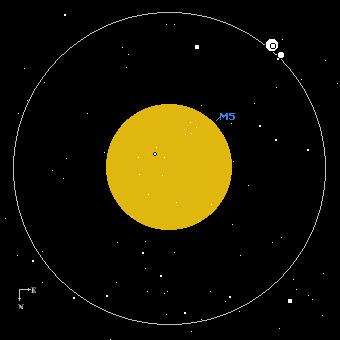 Burnham calls M5 "one of the great show objects of the summer sky, ranking with M13 in Hercules and M3 in Canes Venatici and one of the three finest globulars in the north half of the sky." The approximately 250,000 stars of M5 lie nearly 30,000 light years distant. M5 can be glimpsed in binoculars as a small round hazy patch. A 6-inch scope will reveal many hundreds of individual stars. Larger instruments will resolve this cluster to the core, showing a myriad of glittering points of light. Walter Scott Houston claimed that M5 was visible to the naked eye from a dark site. ![]() The view in an 6-inch at 50x. That's 5 Ser to the upper right. It can make an interesting project to compare M5 to M13 in Hercules, which is also visible at this time of year. Among other things I've noted, M5 has a much smaller core, yet the fainter outlying stars seem to reach as far out as those in M13. It can be argued that perhaps with the exception of Saturn there is no view in the sky more stunning than a globular cluster, and this is one of the finest. Unlike most other objects in the sky, no photograph can capture the beauty you will see in the eyepiece! If you want to share the beauty of the night sky with a non-astronomer, a globular star cluster such as M5 will always delight and never disappoint. ![]() This image is from the DSS and shows a 20' x 20' field. No photograph can do it justice! |