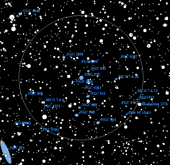 Let's begin our tour with NGC 910. This is the largest and brightest galaxy. Look for it about 1o to the southeast of the much larger NGC 891. This galaxy is relatively easy. It is a typical, round elliptical galaxy with a bright center. It is listed as a 13th magnitude elliptical that is 2' x 2' in diameter. Like most galaxies in this region it lies around 200 million light years away.