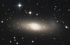 The high surface brightness makes NGC 1023 a good target for suburban skies. A brighter, elongated central bar resides within a broader haze. At the center lies a starlike core. Larger instruments will reveal NGC 1023A, a faint companion that lies off the eastern end (right in image). In my 18-inch f/4.5 the galaxy appeared much thinner (more elongated) than in the image on the right. The axis of the brighter central region is not parallel to the fainter outer haze, producing a sort of twisting effect. The faint, very diffuse glow of the companion galaxy appeared superimposed on the eastern end, blending into an irregular shaped-bulge on this end of the galaxy.