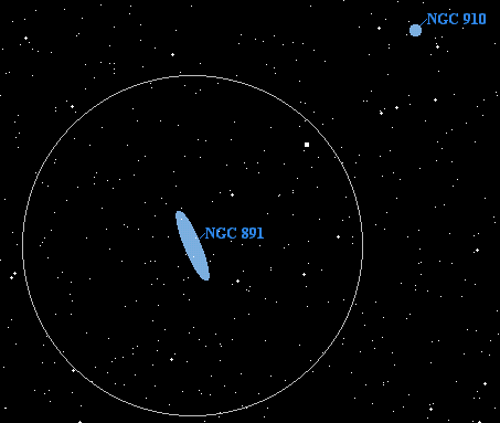 If you are feeling adventurous, you may also want to have a try for the nearby galaxy NGC 910, which lies about 45' to the southeast. This is a small, 2' x 2', 13th magnitude elliptical galaxy that lies some 210 light years distant -- over ten times farther away than NGC 891.
